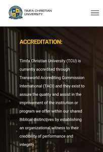 Timfa Christian University (TCU) is currently accredited through Transworld Accrediting Commission International (TACI) and they exist to assure the quality and assist in the improvement of the institution or program we offer within shared Biblical distinctive by establishing
