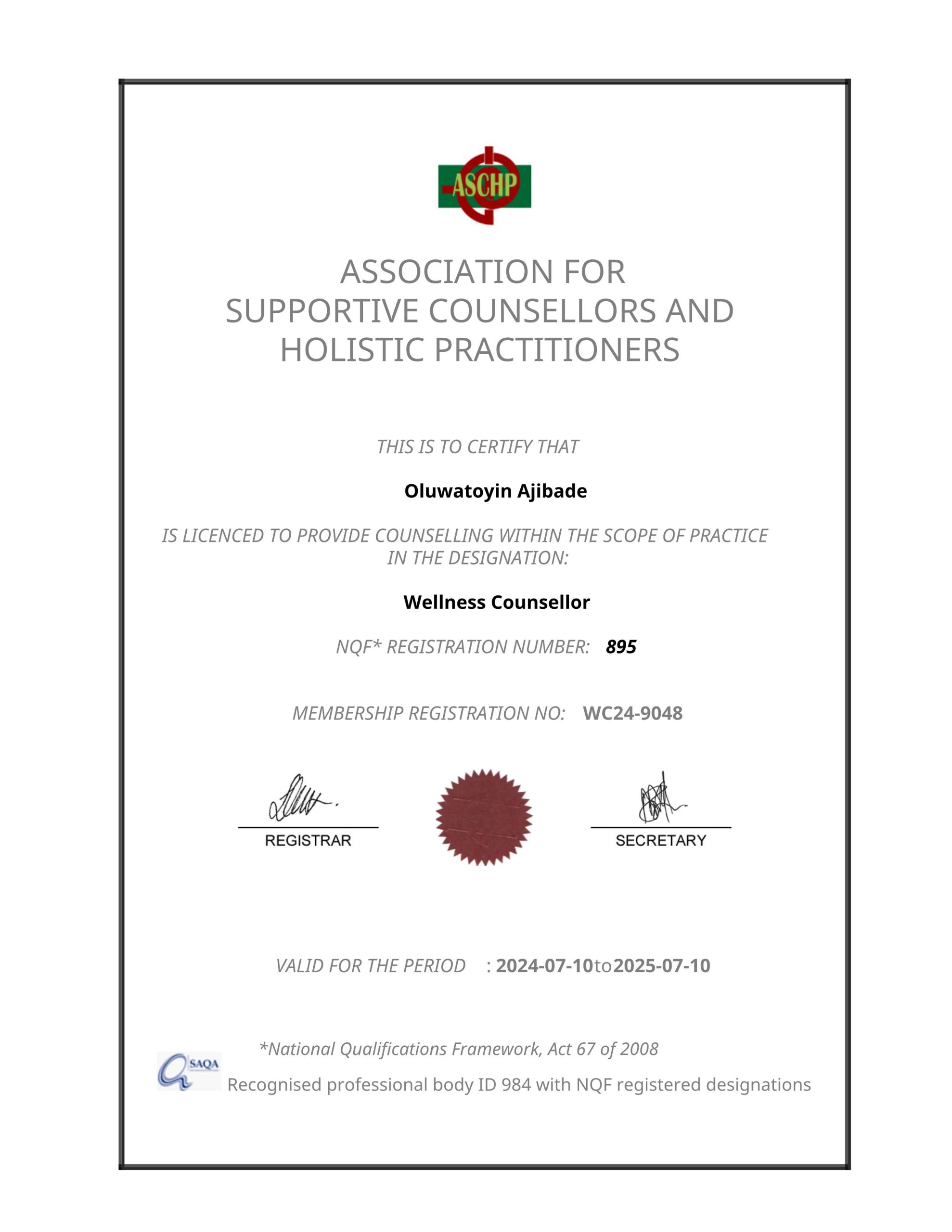 ASCHP is a counseling body that is recognized and accredited by SAQA.